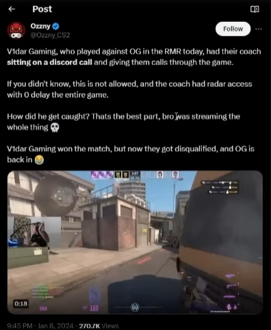 - 어느 한팀의 코치가 디스코드를 통해 실시간으로 상대방의 위치등을 알려주어(작동원리는 모름) 경기에서 이기고 판정 패를 당했다. 재밌는건 걸리기 어려운 이 행위가 걸린이유는 코치가 실시간 스트리밍 중이었기 때문