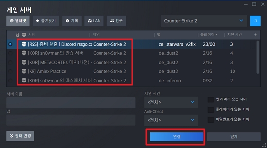 이를 보조 해줄만한 프로그램은 (완벽하게 해당 서버로 가고자한다면 두개를 동시에 하면 거의 성공한다.) CS2 Server Picker 등이 있다. (여러가지 버전있음, 여기 블로그에 있는 버전은 아래 링크)