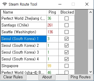 SteamRouteTool.exe 파일을 우클릭해서 '관리자의 권한으로 실행' 후에 원지 않는서버 (예컨데 서울)을 체크 후에 게임을 켜면된다. (게임을 켜기전에 미리 셋팅해놓는것을 권장하며, 한번 셋팅해놓으면 다음부터 저걸 안켜도 그대로 된다.)