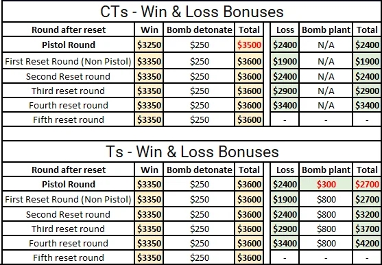 이것보다 디테일 하게 갈수 있지만 간단하게 설명하면 테러의 경우 폭탄을 설치하는 것이 언제나 더 경제적 이득을 가져오며 (초보일 수록 폭탄설치보다 상대방을 죽이는데만 혈안이 되어있음), 연승 보너스는 없는 연패시 자금을 조금 씩 더 받는다. 고로 연승한다면 상대방이 언제든지 소총이 나올 수 있다는 것을 인식하고 플레이 해야한다. 또 라운드가 13승제로 바뀌면서 (기존에 16선승제) 풀에코 등을 이전보다는 많이 하지 않게 되었다. 또 무기류마다 1킬 때 돈을 버는 게 있는데 그게 다다르다 칼이 제일 많고 아마 Awp가 제일 적었던 것으로 기억한다.